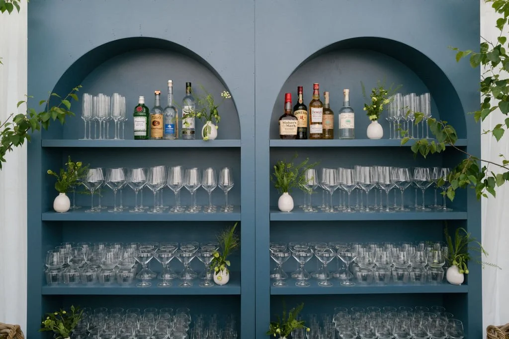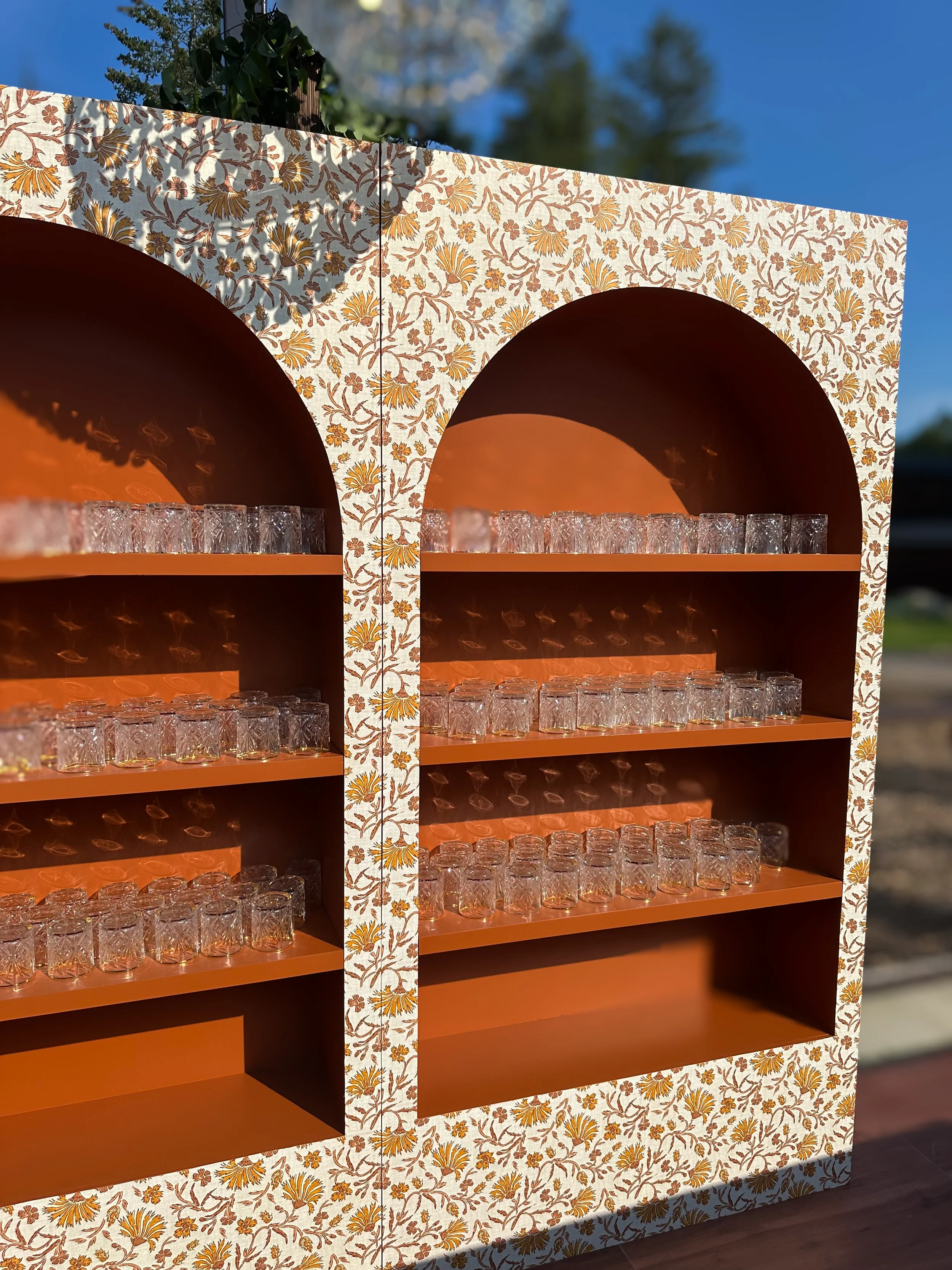 Custom-made 8ft high by 4ft wide shelving units with four shelves. Shelving units are fully customizable with paint and wallpaper to complement the color palette and aesthetic of any event.